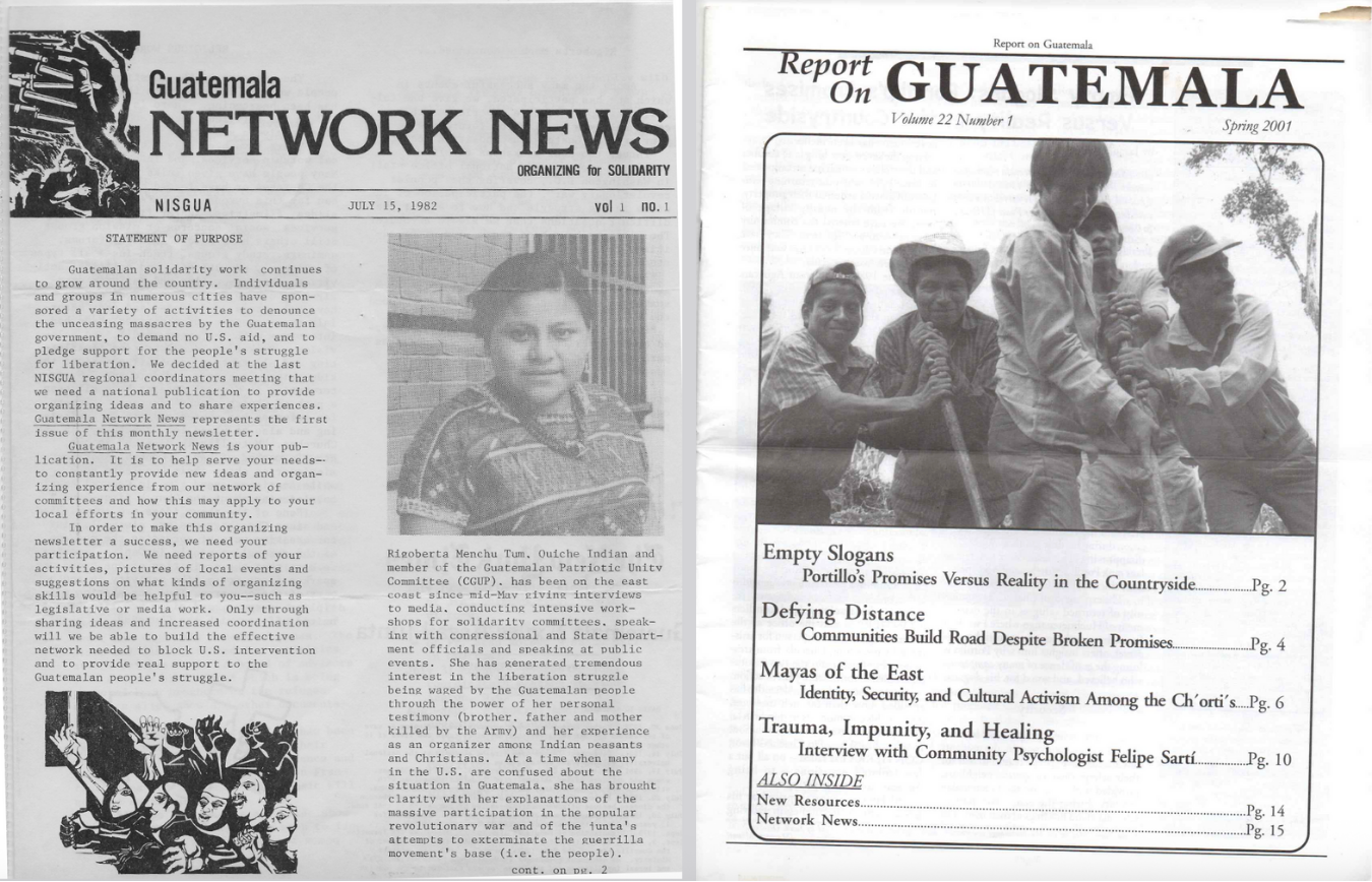 📸 1. 1982 copy of “Guatemala Network News,” including a photo of Rigoberta Menchu Tum, Maya Quiche.