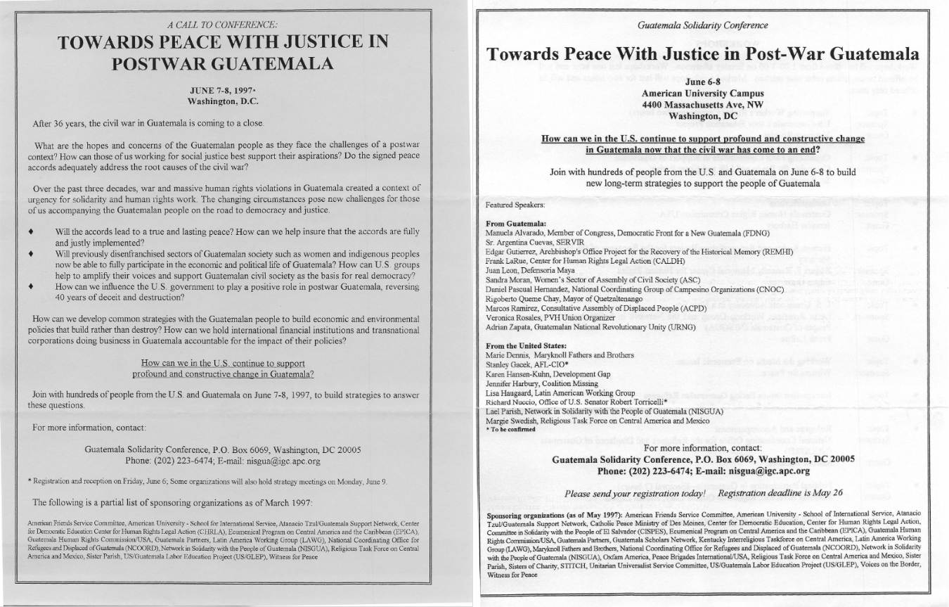📸 1997 conference flyer: ‘Towards Peace With Justice in Post-War Guatemala’ – A solidarity conference held in Washington, D.C. addressing Guatemala’s transition after 36 years of Internal Armed Conflict.