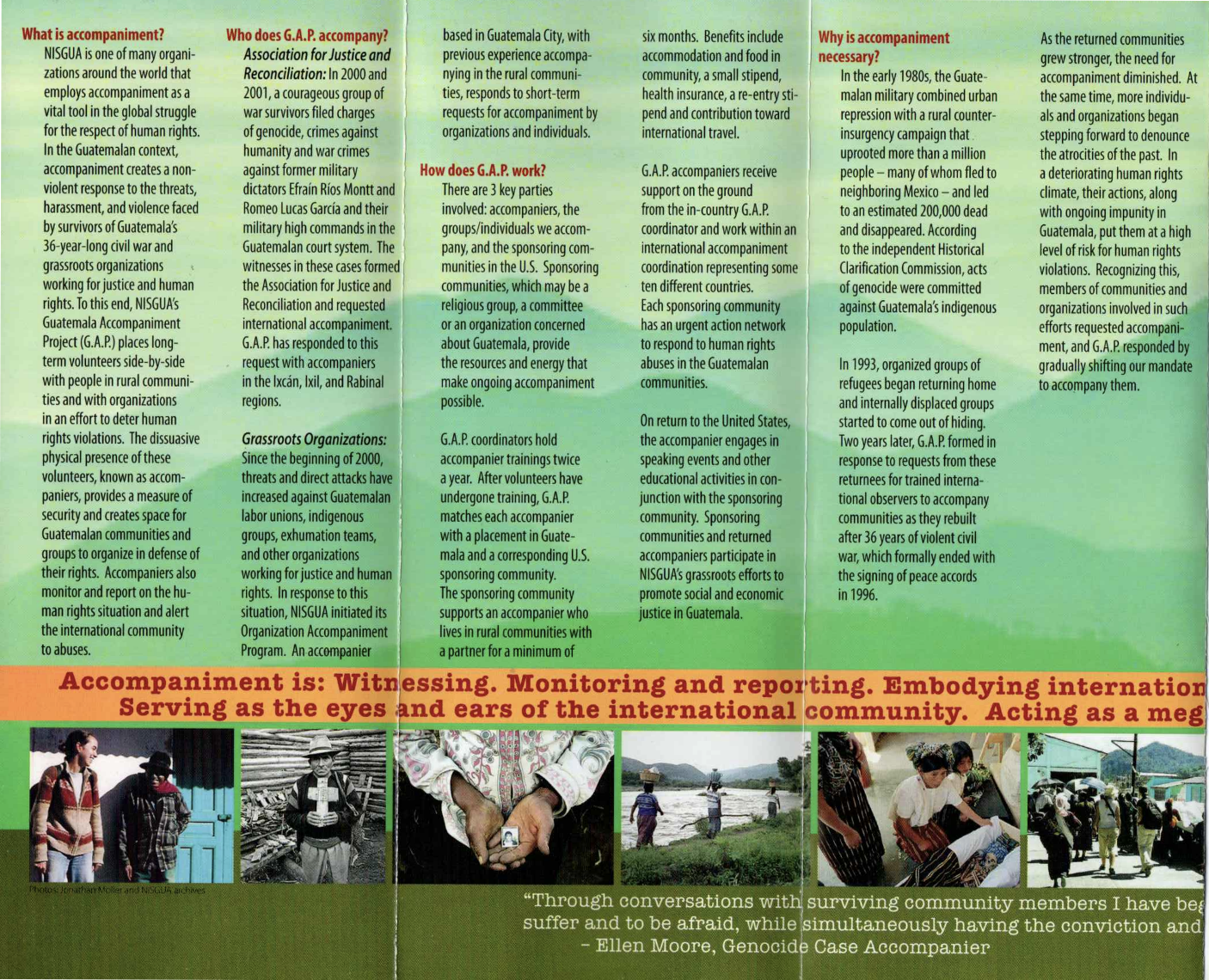 In the 1980s, some 200,000 Guatemalans fled to Guatemala to escape the scorched earth practices enacted by the Guatemalan military, trained by the U.S. government. After a decade in refugee camps, many yearned to return to their ancestral lands. In 1992, refugee leaders signed an agreement with the Guatemalan government to return. For the first time, refugees negotiated the terms of their return with the government of the country from which they fled. As a condition for signing, refugees stipulated their right to an international presence before, during, and after their return. NISGUA conveyed the significance of refugee returns to an international audience and GAP accompaniers journeyed with the refugees back to their homes, then lived with them as they rebuilt their communities and engaged in new struggles for demilitarization, social services, and the right to self-governance.