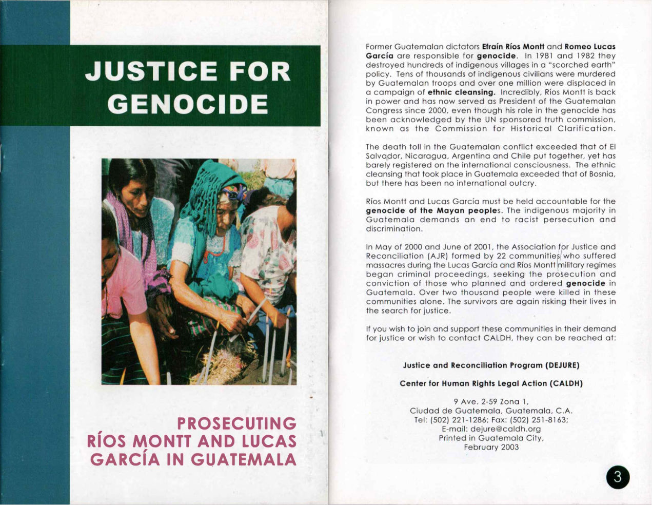 After a phase of local organizing, the Association for Justice and Reconciliation (AJR) filed charges of genocide and crimes against humanity against former dictators Romeo Lucas García and Efraín Ríos Montt and their respective military high commands. The AJR and their lawyers at the Center for Human Rights Legal Action (CALDH) requested formal international accompaniment to act as a dissuasive presence for possible attacks against the survivors during the trials.