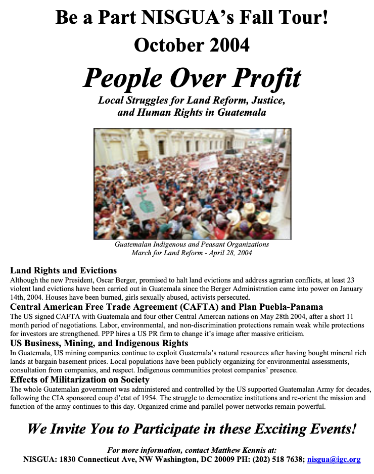 📸 Flyer for NISGUA’s 2004 Speaking Tour, “People over Profit,” which featured Rudy Monterroso, Carlos Humberto Muralles, Arnoldo Yat, and Luisa Xinico Yos.