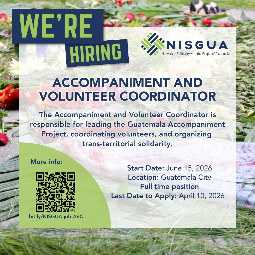 We are looking for a Guatemala City-based Accompaniment and Volunteer Coordinator —this person will ensure our decades long commitment to internationalist solidarity with front-line struggles in Guatemala remains strong and relevant in the times we are in.