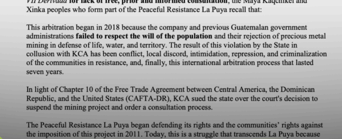 Statement from the Peaceful Resistance La Puya on the ICSID Decision in KCA v. Guatemala / Comunicado de la Resistencia Pacífica La Puya sobre la decisión del CIADI en el caso KCA vs. Guatemala