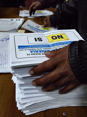 On February 18, 2011, in the 49th good faith community referendum celebrated in Guatemala, 33,428 men, women, and children rejected all mining exploration and exploitation in the municipality of San Juan Ostuncalco, Quetzaltenango. 79 individuals voted in favor. The Prensa Libre and El Quetzalteco newspapers covered the event, and an editorial published by the latter demonstrated a clear stance in favor of indigenous communities organizing to defend themselves against the prospective extraction of natural resources in their territories. The referendum was carried out in the shadow of a controversial initiative by the Colom administration to propose a law that would regulate the realization of community consultations in Guatemala. During a visit to Guatemala in August, 2010, Luís Rodríguez-Piñero, a member of the team of the U.N. Special Rapporteur on the Fundamental Rights of Indigenous Peoples, called upon the Guatemalan government to enact national legislation regulating the execution of community referenda, In June, 2010, the Rapporteur, himself, James Anaya, pointed out that the lack of clear legislation with regards to community consultations is frequently taken by Guatemalan authorities as a lack of legal obligations on the matter. Communities and organizations fear, however, that the new initiative will serve the purpose of deligitimizing the community referenda, as opposed to granting such processes validity in the eyes of the government.