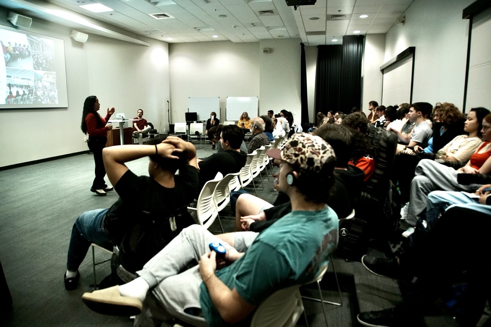 📸 Sheny Lemus habla en un evento universitario durante la gira de charlas de NISGUA en Carolina del Norte.