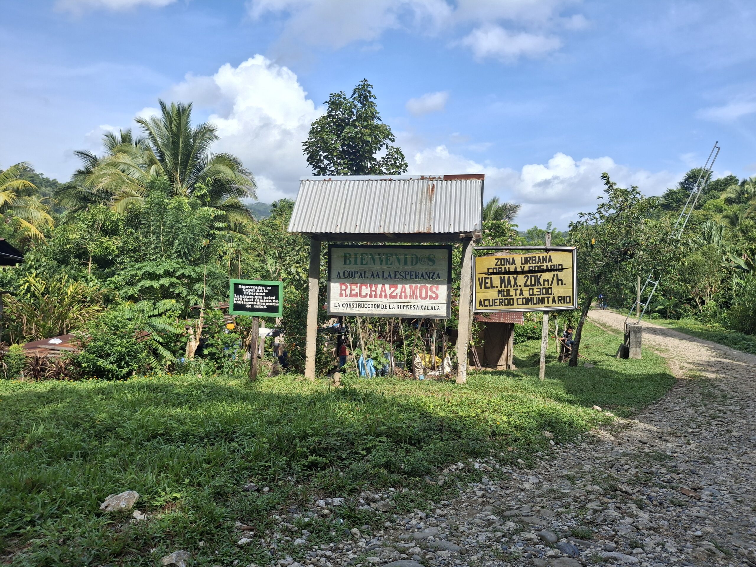 📸 Letrero colocado a la entrada de la comunidad Copal AA La Esperanza donde dice que rechazan la construcción de la hidroeléctrica Xalalá. Foto de NISGUA, junio de 2025.