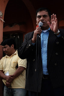 The municipal mayor of Huitán, Javier López Lucas, addresses the gathered public at the close of voting. Graham Hunt