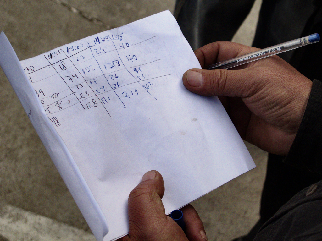 | The community leader kept a count of the number of voters passed through the voting center throughout the day. Graham Hunt El líder comunitario anotaba la fluencia de los votantes por el centro de votación a lo largo del día.