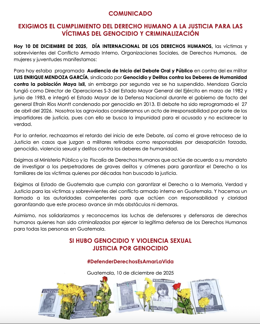 The hearing to commence oral and public debate was scheduled for today against the ex-military official LUIS ENRIQUE MENDOZA GARCIA, charged with Genocide and Crimes Against Humanity against the Maya Ixil people, and it was suspended for the second time. Mendoza Garcia served as the Director of Operations of S-3 of the army general staff from March of 1982 to June of 1983, and was part of the general staff of the National Defense during the de facto government of Efraín Ríos Montt, who was found guilty of genocide in 2013. The debate has been rescheduled for April 27, 2026. We the aggrieved parties consider this an act of negligence on the part of the administrators of justice, as this seeks impunity for the accused and does not seek to clarify the truth.