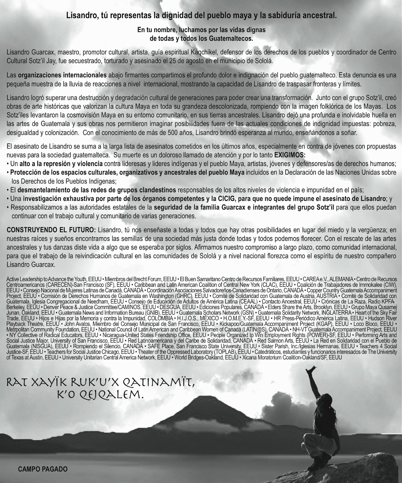Lisandro Guarcax era un visionario, artista, maestro, y miembro fundador del Grupo Sotz’il. Él fue secuestrado, torturado, y asesinado el 25 de agosto de 2010. Su muerte produjo una gran reacción nacional e internacional. |