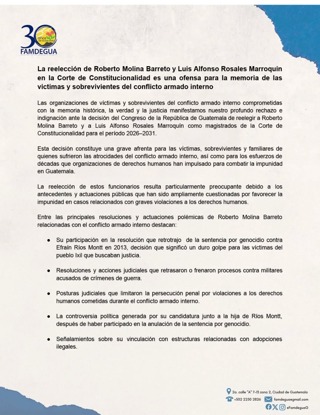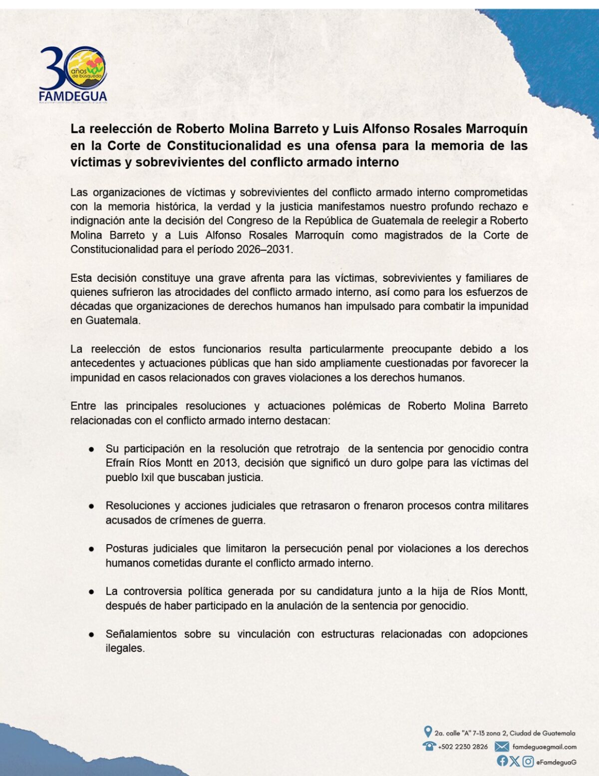 The organizations of victims and survivors of the Internal Armed Conflict (IAC) committed to historical memory, truth and justice declare our profound rejection and indignation regarding the decision of the Congress of the Guatemalan Republic to re-elect Roberto Molina Barreto and Luis Alfonso Rosales Marroquín as magistrates of the Constitutional Court for the 2026-2031 term.