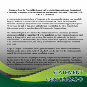 • Statement from the Peaceful Resistance La Puya on the ICSID Decision in KCA v. Guatemala / Comunicado de la Resistencia Pacífica La Puya sobre la decisión del CIADI en el caso KCA vs. Guatemala